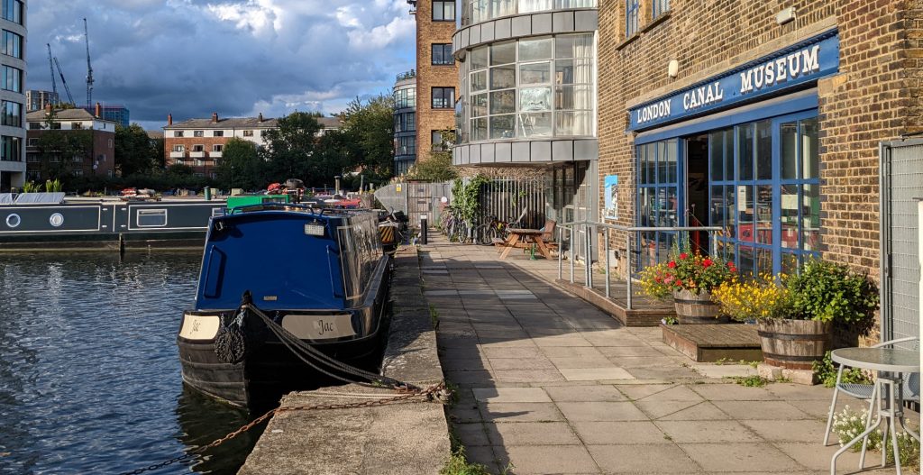 Our trip back through central London began at 10:15 as we didn’t have much to do today. The canal was busy with boats and the towpath full of people walking in the sunshime. A space opened up at Victoria Park for lunch 12:45-13:30, but it was across a water outlet and would not have made a suitable overnight stop. We had booked the mooring at the London Canal Museum, arrived at 15:35 and visited museum before it shut, and went to see Light Festival in the evening so plenty to do.