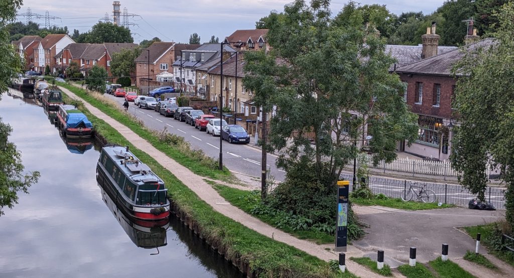 We find a decent mooring at 16:30, just above Enfield lock. Enfield Lock “village” is a redevelopment of the old Ordance works, now with community housing and a convience store. We also visit The Greyhound, a McMullens pub on the cut.